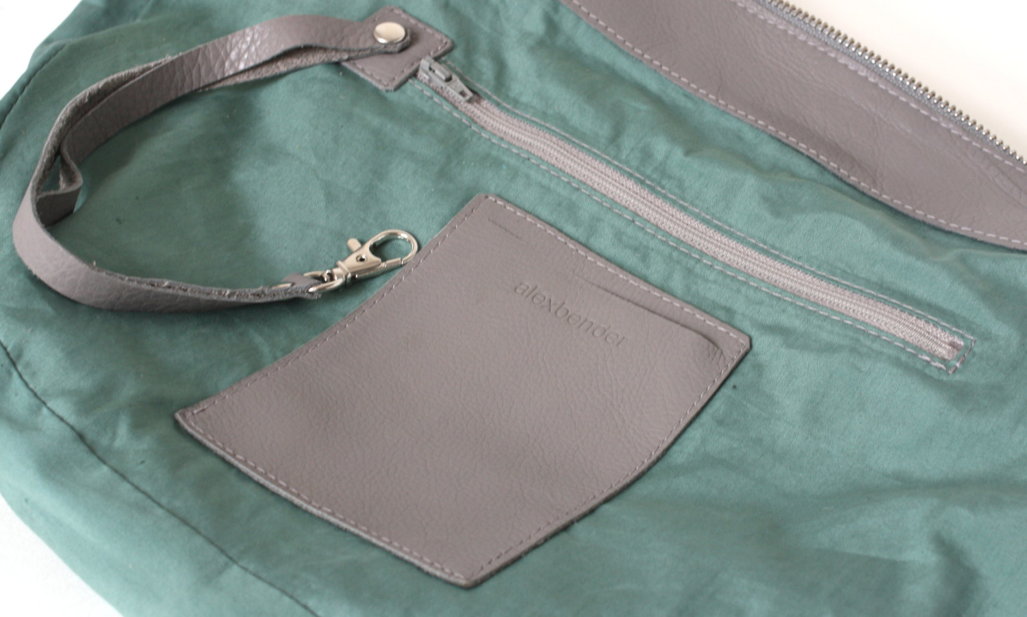 • Bolsa de tecido verde com bolso e alça de couro cinza