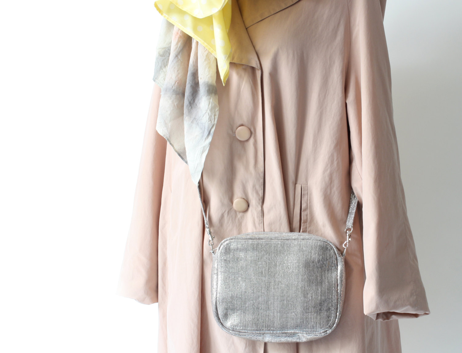 • Casaco bege claro com bolsa prateada e lenço amarelo e cinzento