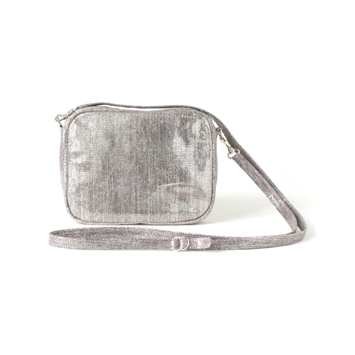 Shiny crossbody bag made of structured silver calf leather.