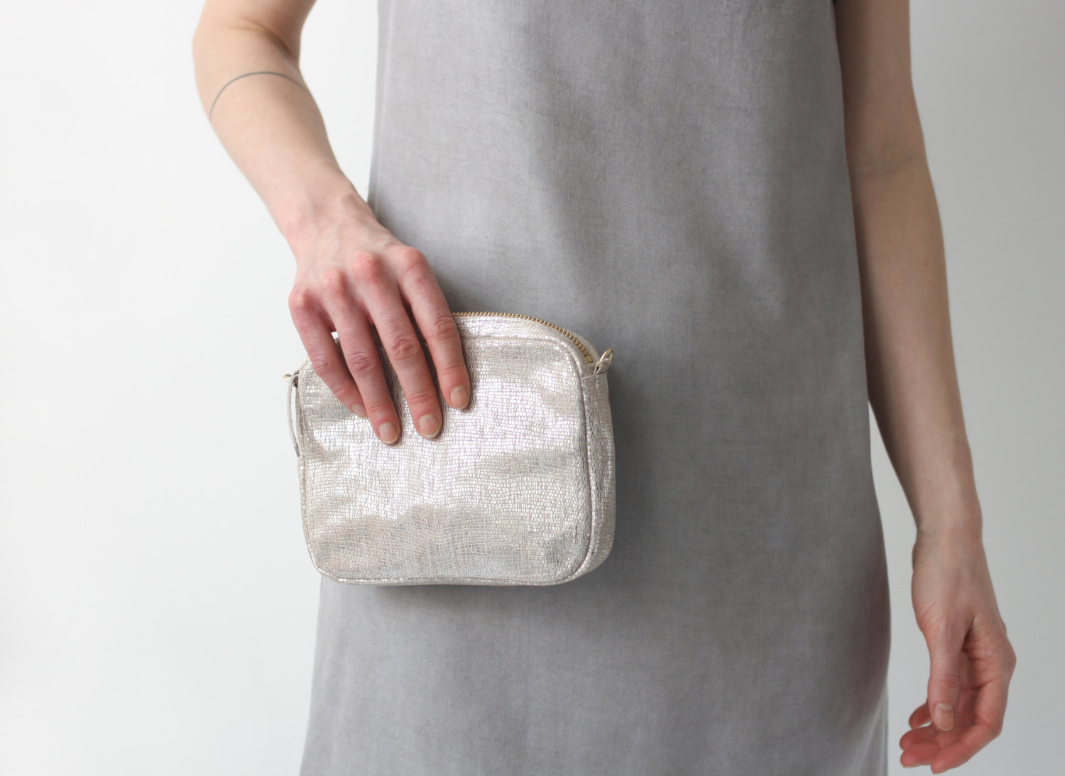 • Bolsa pequena prateada sendo segurada por pessoa com vestido cinza claro